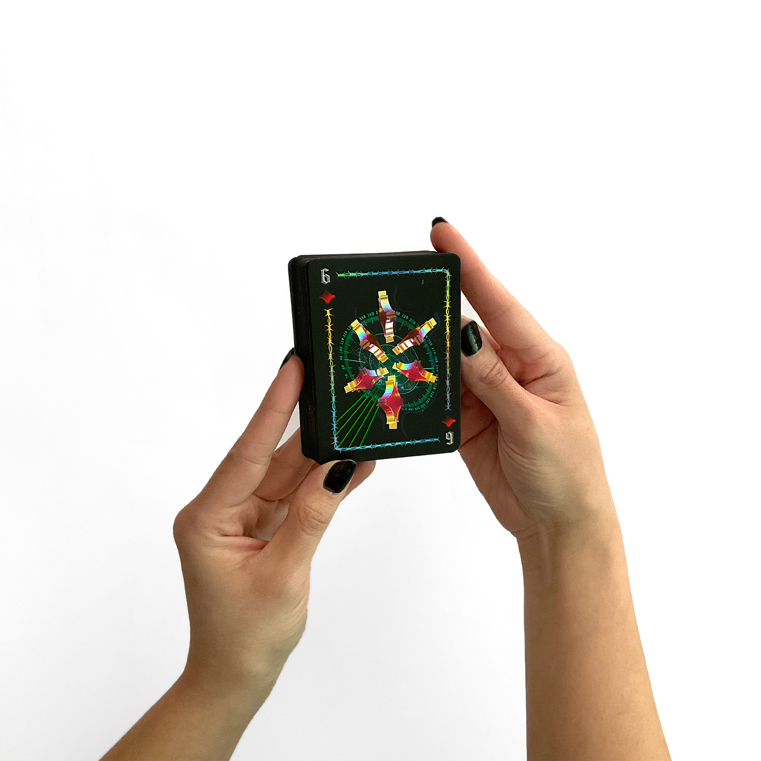 Deal your next hand with playing cards with a stylish three-dimensional Cyberpunk theme! Original, hand-modeled artworks depicting astronomy, astrophysics, grunge graphic style, abstract forms, high technology features, bold and vibrant colors; and dark futuristic characters. We keep them all in a collectible box with shiny foil accents. The box itself has embossed glossy details. Every main character (13 characters (such as Jack, Queen, King and Joker)) is designed in 3D with translucent material. In this design, there are also some retrofuturistic cultural details to represent technological developments as well. Every card is designed uniquely like artwork. The Pulsarity playing card deck by Lunart Design was designed in almost one year due to the details of characters .